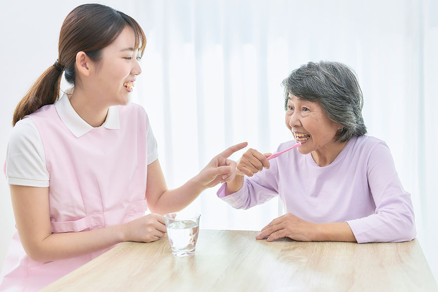 「おはようございます」のお声かけで1日が始まります。着替えや洗顔などのケアをさせていただきます。