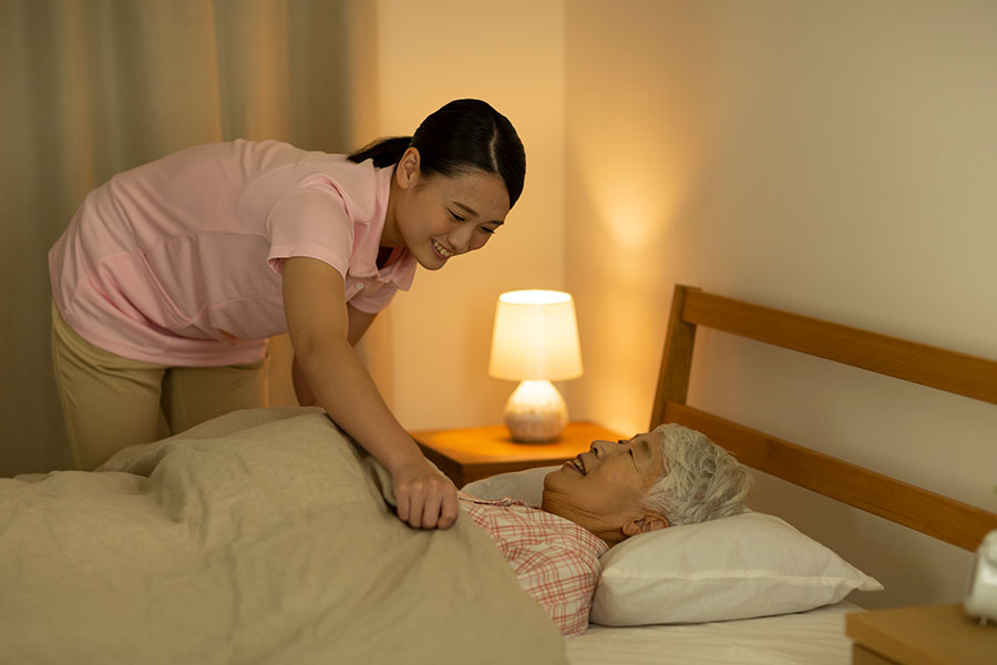 個室の場合は基本的に寝る時間は自由です。安心して眠れるように、夜間はスタッフが見守り巡回