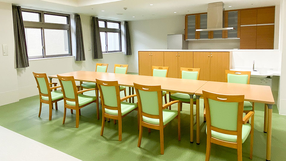 入所されている方々の日常の癒しの空間としてはもちろん、面会に来たご家族にもゆったりくつろげる開放的なスペースを提供します。広々とした空間で、家族と大切な時間を快適にお過ごしいただけるように設計しました。