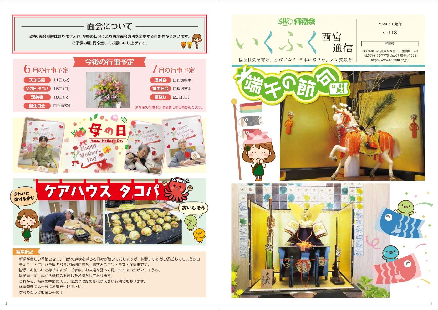 2024.07.01 いくふく西宮通信vol.18 今号では4月、5月の施設の取り組みを掲載しています。 コティコート仁川バラ園では、綺麗なバラが満開になりました。お立ち寄りいただいた際には、ぜひ色とりどりのバラをご鑑賞ください♪ PDFをダウンロード