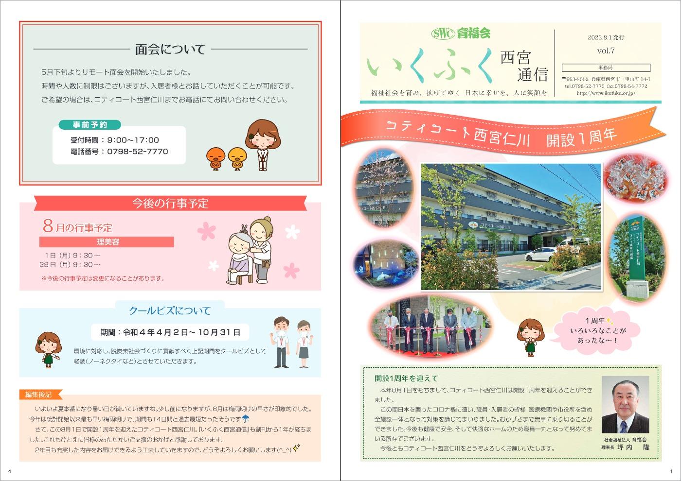 2022.08.01 いくふく西宮通信vol.7 ついにコティコート西宮仁川が開設1周年を迎えました! 今号では、開設から1年間の思い出の写真や、6月、7月の施設の様子などを掲載しています。 リニューアルされたケアステーションの写真も掲載しています。 PDFをダウンロード